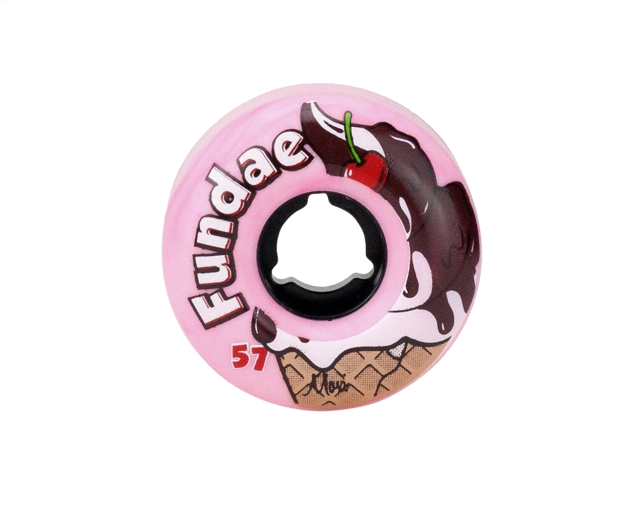 Fundae wheels are 57 mm in diameter and 34mm wide. We tested them at a 92 durometer. We Recommended for slick surfaces and skaters new to ramps that don’t want a wheel as hard as most other park wheels. Can also be used in streets and outdoors for those experienced that want more speed and don’t require the usual softer wheels.