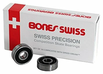 Bones Swiss bearings; the standard for over 24 years. Single non-contact, removable rubber shield, high speed nylon ball retainer, pre-lubricated with Speed Cream. The best-selling high-end skate bearing the US.
